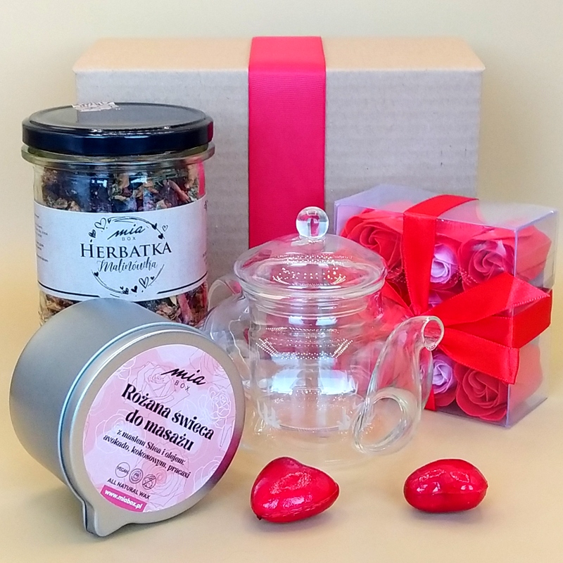 Box wypełniony smakami i aromatami natury. Smakowicie pachnąca kraftowa herbata malinowa w komplecie ze szklanym dzbankiem z zaparzaczem oraz mydlane kwiaty do kąpieli w kształcie czerwonych róż i różana świeca do masażu z dodatkiem olejów kosmetycznych i eterycznych mających właściwości pielęgnujące zapewni chwilę odprężenia i ukojenia po ciężkim dniu. Prezent zarówno praktyczny jak i  aromatyczny:)