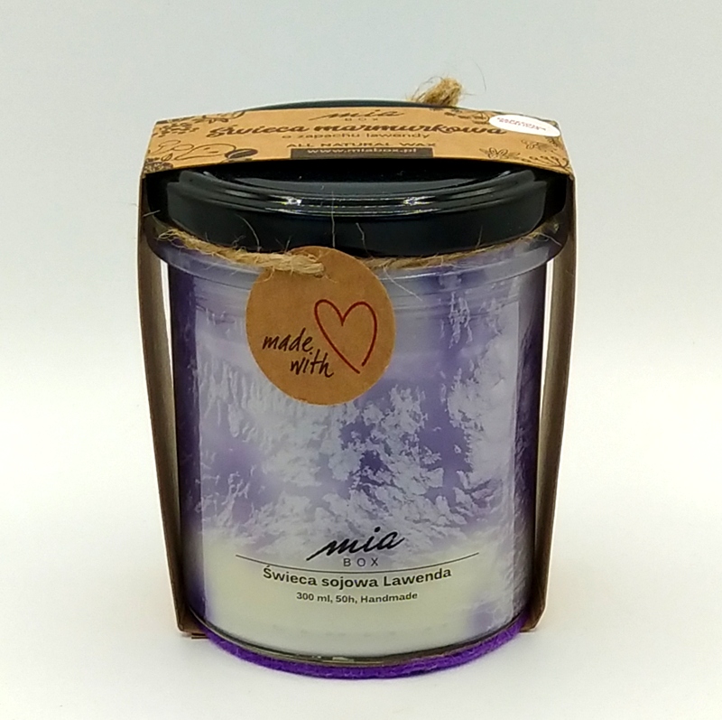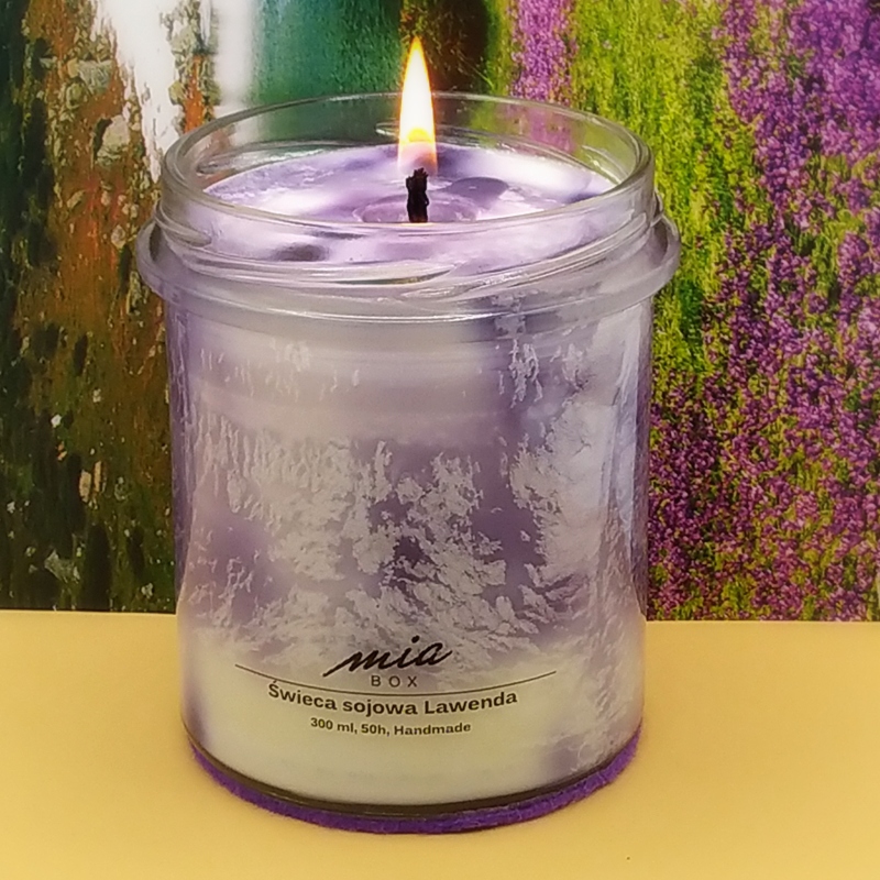 Ręcznie robiona świeca zapachowa z wosku sojowego o wspaniałym zapachu niezawodnej lawendy. Wosk sojowy pali się wolniej i czyściej niż zwykły wosk, co skutkuje dłuższym czasem spalania świecy.