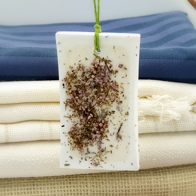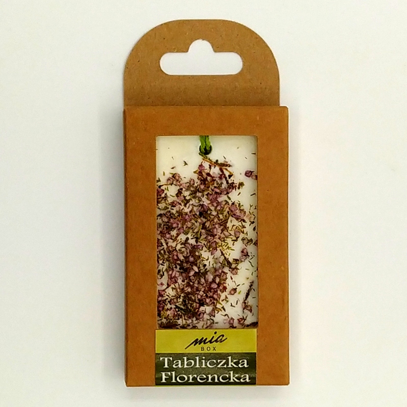 Ręcznie wykonana, niepowtarzalna tabliczka z wosku sojowego z dodatkiem olejków zapachowych, masła shea, suszonych kwiatów, owoców, ziół, ziaren oraz innych ekologicznych zdobień. Powoli uwalniając swój piękny zapach aromatyzuje pomieszczenia i poprawia nastrój. To estetyczny nośnik wspaniałych nut zapachowych, które równocześnie służą jako unikalne elementy dekoracji. Tabliczka florencka jest naturalnym, ekologicznym produktem do szerokiego zastosowania. Umieść ją na komodzie, zawieś w łazience, włóż do szuflady lub szafy, a jej wnętrze wypełni się pięknym, uwodzicielskim zapachem. To wspaniały prezent, oryginalny i niepowtarzalny. Nie ma dwóch takich samych tabliczek. Ich wykonanie to 100% handmade;).
