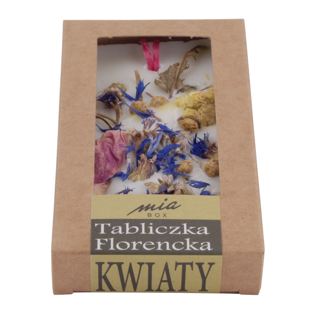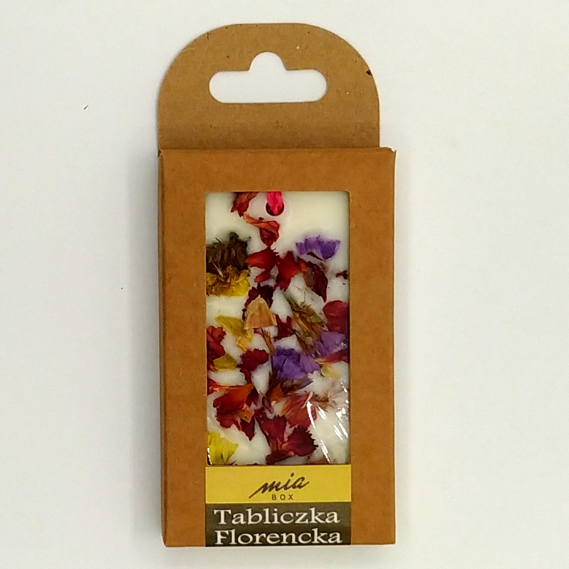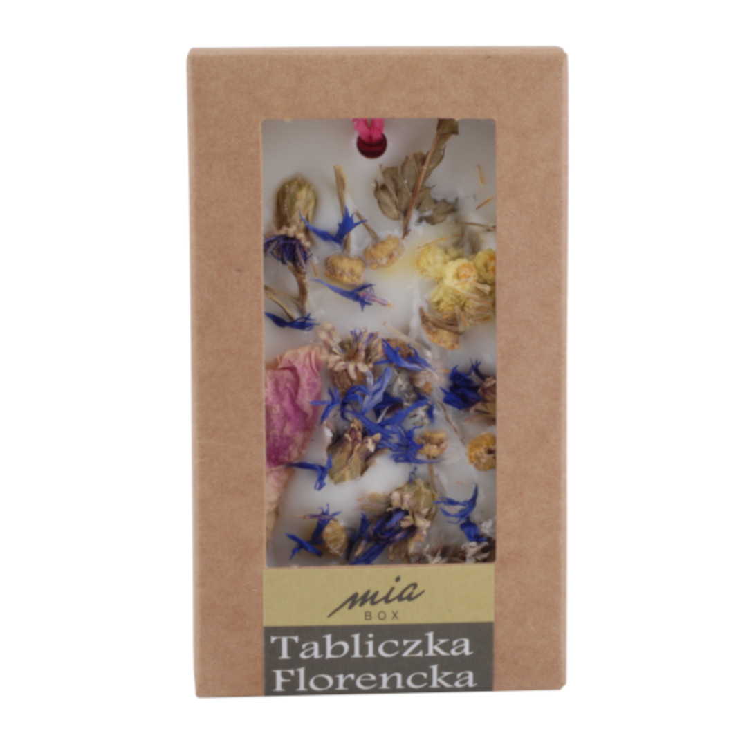 Ręcznie wykonana, niepowtarzalna tabliczka z wosku sojowego z dodatkiem olejków zapachowych, masła shea, suszonych kwiatów, owoców, ziół, ziaren oraz innych ekologicznych zdobień. Powoli uwalniając swój piękny zapach aromatyzuje pomieszczenia i poprawia nastrój. To estetyczny nośnik wspaniałych nut zapachowych, które równocześnie służą jako unikalne elementy dekoracji. Tabliczka florencka jest naturalnym, ekologicznym produktem do szerokiego zastosowania. Umieść ją na komodzie, zawieś w łazience, włóż do szuflady lub szafy, a jej wnętrze wypełni się pięknym, uwodzicielskim zapachem. To wspaniały prezent, oryginalny i niepowtarzalny. Nie ma dwóch takich samych tabliczek. Ich wykonanie to 100% handmade;).
